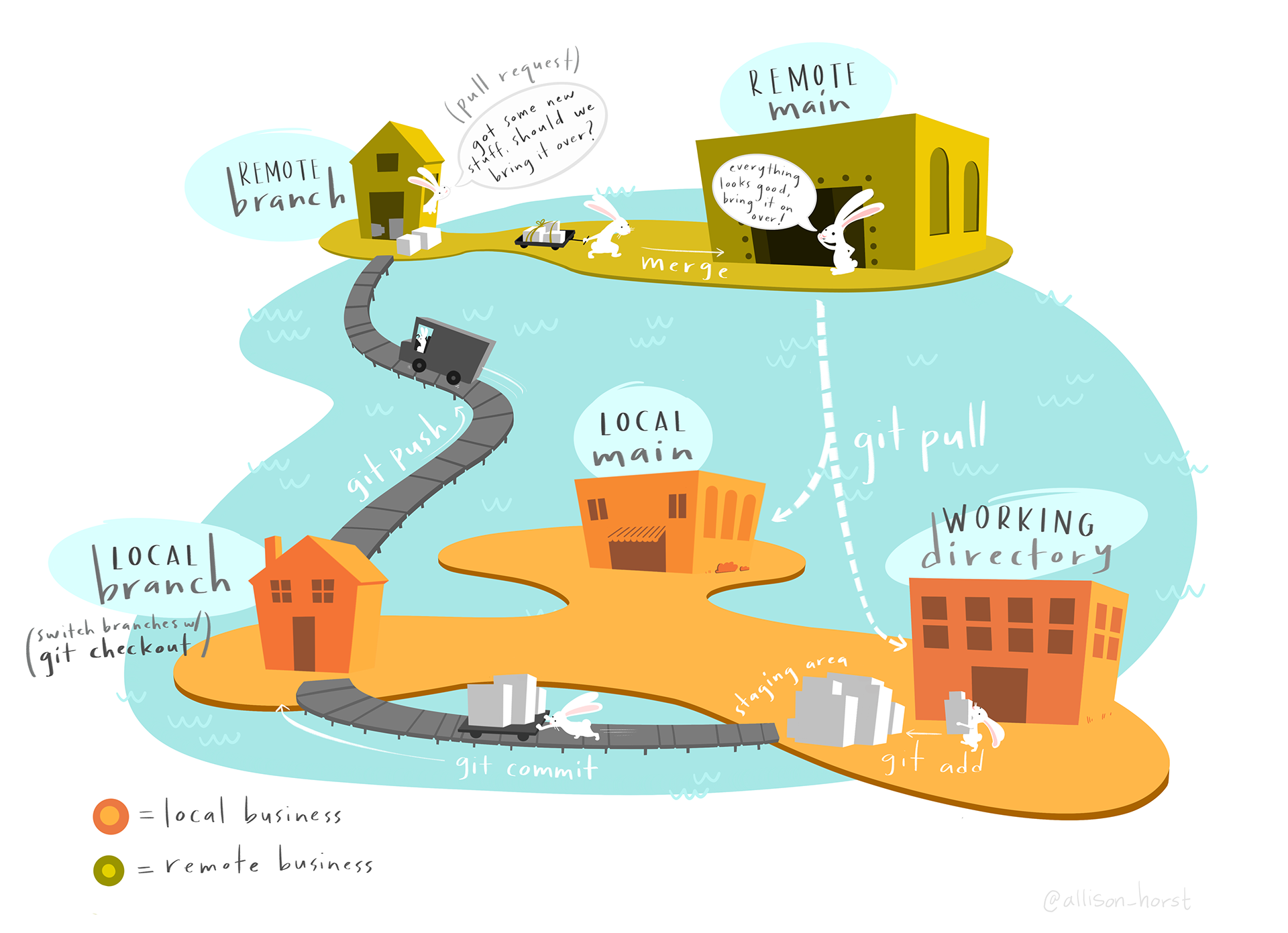 git branch new-branch-namegit checkout new-branch-namegit add ., git commit -m "message"git checkout main, git merge new-branch-name
