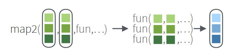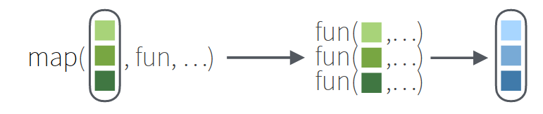 purrrmap family of functions: works by taking a vector (or list), applying a function to each of those items, and outputting the results from each function call.